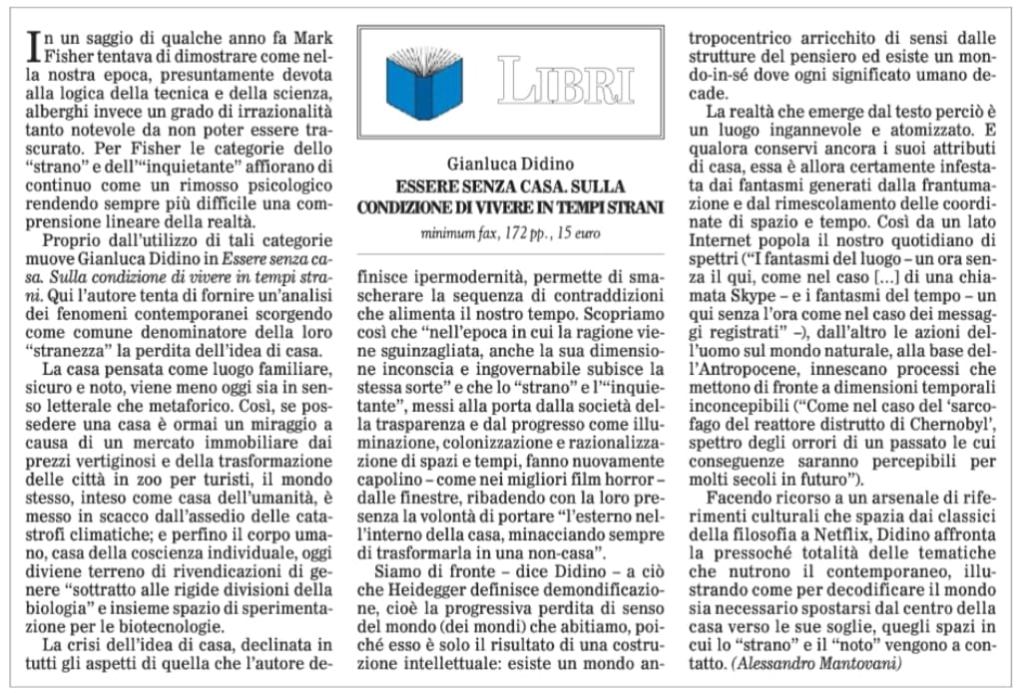 Due segnalazioni che riguardano Essere senza casa: oggi Alessandro Mantovani ne scrive sul Foglio definendolo “uno tra i saggi più interessanti provenienti da autori italiani che mi sia capitato di leggere negli ultimi tempi” (recensione nella foto qua sotto). Invece sabato 22 intorno alle 15:30 italiane sarò ospite di Graziano Graziani a Pantagruel su Radio Rai 3: parleremo di case, weirdness e di come la pandemia ha cambiato l’abitare nelle grandi metropoli occidentali.